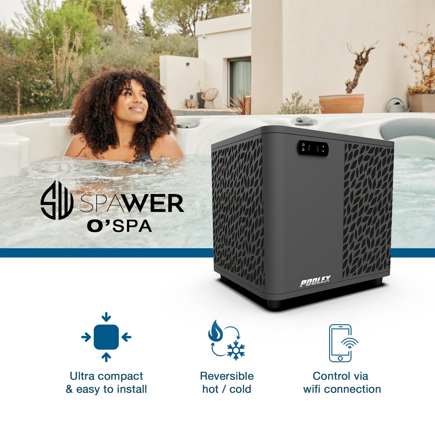The O’Spa is equipped with Wi-Fi temperature control and a programmable timer via the Smart Life App, compatible with iOS and Android devices. It operates in temperatures as low as -7°C with automatic de-icing, offering flexibility with reversible hot/cold settings for heating, cooling, or chilling applications.